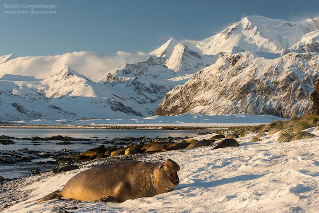 Bei der Menge an Pelzrobben, welche die Strände hier bevölkern, ist es ziemlich schwierig, sich in Ufernähe zu bewegen, ohne eine Robbe zu verstimmen. Schätzungsweise 6 Millionen Antarktische Seebären gibt es wieder hier auf Südgeorgien, wobei die Anzahl weiterhin steigt. Auf dieser einen Insel leben 98 Prozent der globalen Population! Das obige Bild ist ein 'leerer' Strand hier bei uns tief im Fjordinneren. Die Küsten mit direktem Zugang zum offenen Meer sind viel, viel voller. Dort kann man sich als Mensch wirklich gar nicht mehr bewegen! Zumal auf den Stränden ja 'nur' jene Robben sind, die geschlechtsreif sind bzw. einem Harem zugehören. Die Jungen und Außenseiter wandern hinein in die Vegetation und klettern im Laufe des Sommers gar die Berghänge empor, wo sie sich liebend gerne zwischen den Tussockgräsern verstecken. Wie oft wir uns dort gegenseitig erschreckt haben, kann ich schon gar nicht mehr zählen...